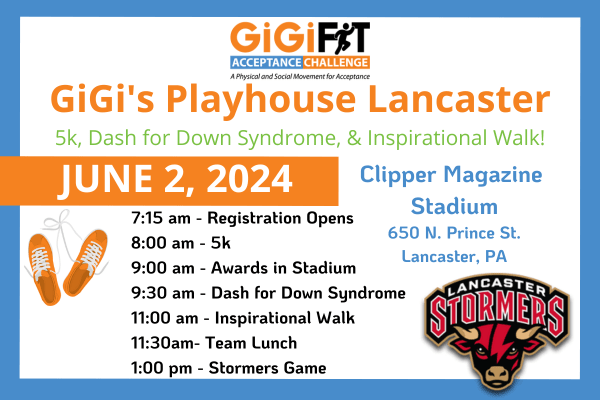 We hope you can join us for our GiGiFIT Acceptance Challenge at the Clipper Magazine Stadium, Home of the Lancaster Barnstormers this year on Sunday, June 2, 2024. We encourage you to create a fun team name and join us in peer-to-peer fundraiser. There will be a 5K, Inspirational Walk, and a Dash for Down Syndrome, followed by a baseball game.