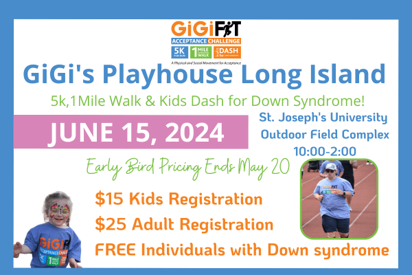 On June 15, 2024, GiGi’s Playhouse Long Island will host the 3rd Annual 5K Run, Family Walk and Kids’ Dash as part of the National GiGiFIT Acceptance Challenge. We will join all GiGi’s locations to spread acceptance for ALL around the globe.
