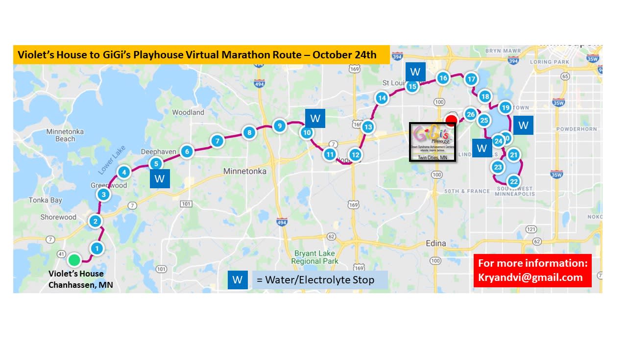 On October 24th at 8am, I (Karen Ryan) -- with the help and support of Ellie Muench and her team of volunteers -- will be running the Twin Cities Marathon via a unique route from my house to GiGi's Playhouse. This is what is known as a "virtual" marathon and I'm doing it to raise funds for the nonprofit GiGi’s Playhouse Twin Cities, a Down syndrome community center that provides free educational and skill building programs for individuals of all ages who have Down syndrome. As one of the 6 founding moms of GiGi's Playhouse, it is a special place for me and, more importantly, my daughter Violet & her best friend Ava Muench, and all the other wonderful members of the Down syndrome community in the Twin Cities.